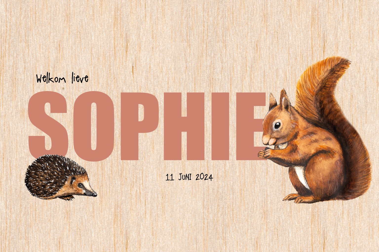 Lief en hip geboortekaartje voor de geboorte van je dochtertje van hout met een schattige illustratie van een eekhoorn en egeltje. In onze online editor kan je dit kaartje naar wens aanpassen.