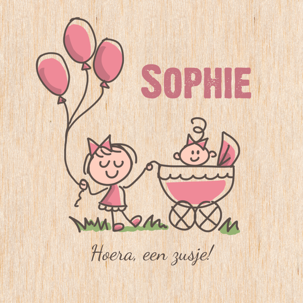 Kondig de geboorte van jullie dochter en zusje aan met dit mooie kaartje. Op het kaartje staat de illustratie van een grote zus die loopt met de kinderwagen. De ballonnen geven dit kaartje een feestelijke uitstraling. Pas het kaartje aan in onze online editor en bestel een proefdruk om dit kaartje in het echt te zien!