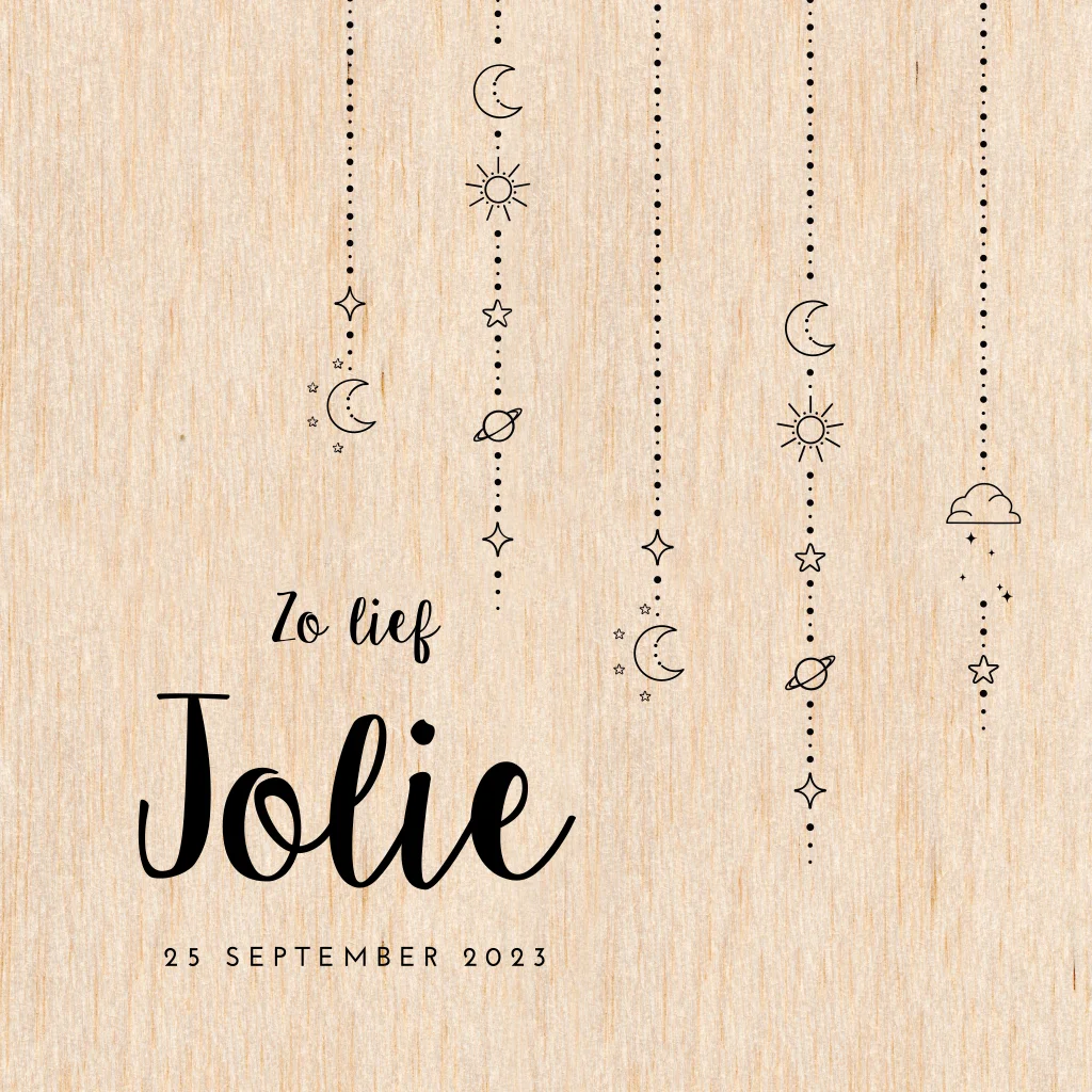 Dit echte houten kaartje heeft ook nog eens originele ronde hoeken. Het design is origineel, met de kleine maantjes, sterretjes, zonnetjes en planeten. Alle aandacht gaat naar de naam in het sierlijke zwarte lettertype.