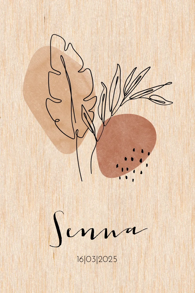 Stijlvol geboortekaartje voor je dochtertje met lijntekening en organische vormen in natuurlijke tinten. Deze kaart is erg hip en doet botanisch aan. Het ontwerp wordt gedrukt op echt hout.
