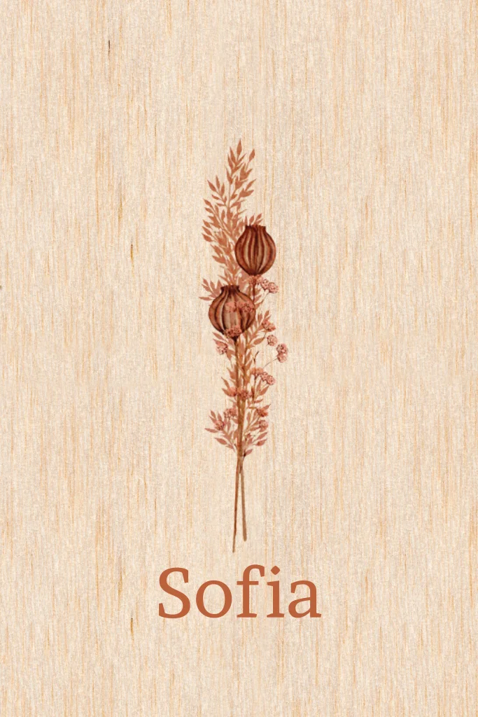 Een hip houten geboortekaartje met de illustratie van droogbloemen. De droogbloemen zijn getekend in een roestkleur. Je kan dit kaartje naar wens aanpassen in onze online editor.| Totaalprijs: 0 |