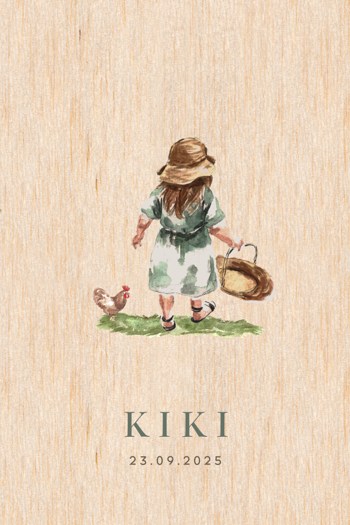 Op dit kaartje voor jullie pasgeboren dochtertje staat de tekening van een meisje met een mand in haar handje. Naast het meisje staat een kip. Het kaartje wordt gedrukt op echt hout waardoor de illustratie extra goed naar voren komt. Ook heeft het kaartje ronde hoeken.