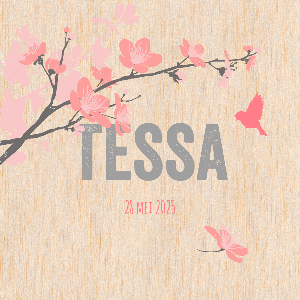 Romantische geboortekaart voor een meisje met een roze bloesemboom en vogeltje. Dit kaartje wordt op echt hout gedrukt, wat het erg origineel maakt!