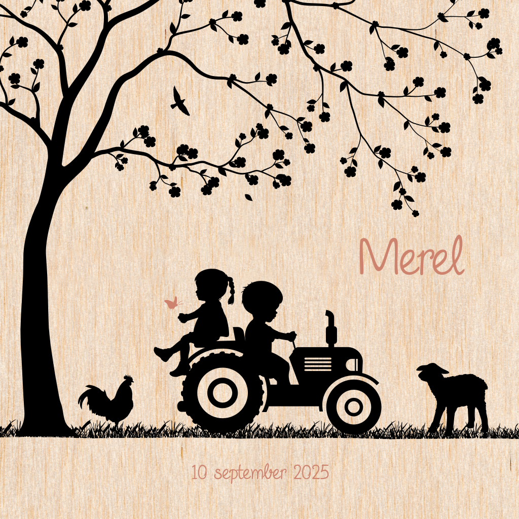 Lief, echt houten geboortekaartje voor een zusje met de silhouet van twee kindjes op een tractor onder een boom.Totaalprijs: 0 |