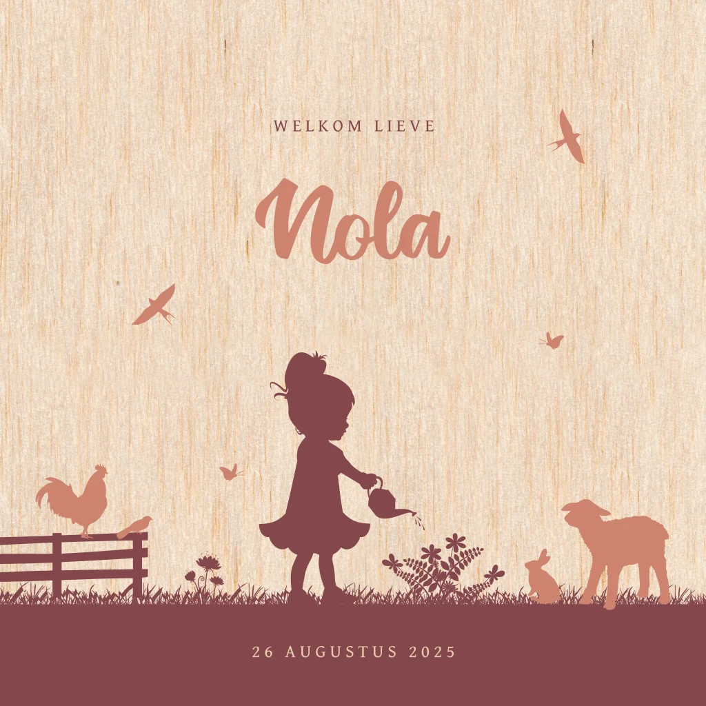 Lief, houten geboortekaartje voor een meisje met silhouet van een kindje die bloemen water geeft en dieren in oudroze tinten. De volgende tekst toevoegen aan de omschrijving: