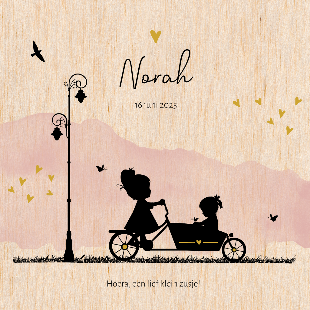 Lief echt houten geboortekaartje voor een zusje, met een silhouet van twee zusjes op een fiets en een lantaarnpaal op roze watercolor.| Totaalprijs: 0 |