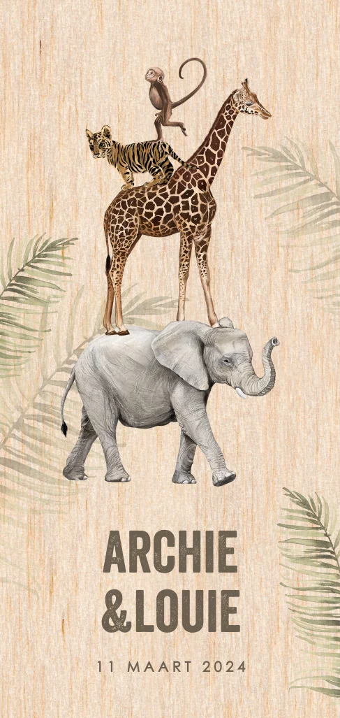 Stoer echt houten geboortekaartje voor een jongens tweeling. Met geïllustreerde jungledieren en bladeren.| Totaalprijs: 0 |