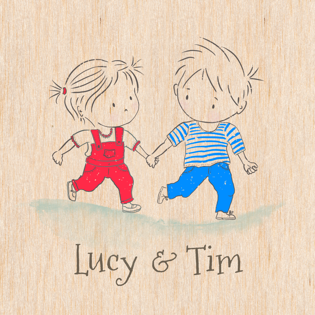 Een houten geboortekaartje met een leuke illustratie van een jongetje en een meisje, hand in hand voor een zoon en een dochter. Er is ook een mooie blauwe watercolour te zien.