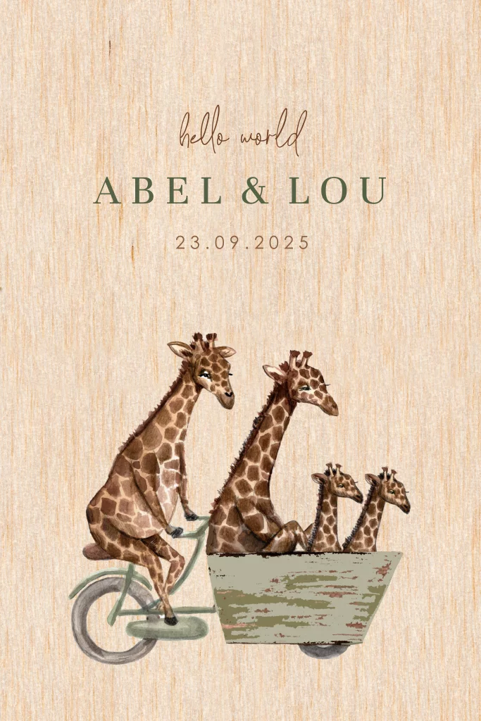 Dit lieve babykaartje wordt gedrukt op echt hout! Op het kaartje staat de illustratie van twee grote giraffen op een bakfiets. Voorin zitten twee kleine girafjes.