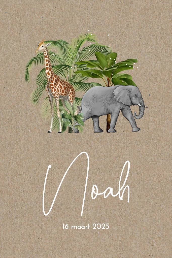 Kraft geboortekaartje voor zoon met olifant en giraf in jungle