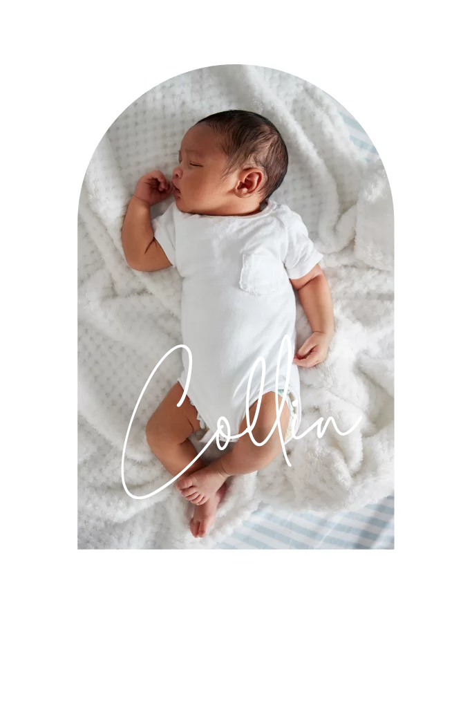 Een origineel kaartje met ronde hoeken en een witte achtergrond. In het midden staat een foto van jullie kleintje. De naam en andere details worden gedrukt in goudfolie.