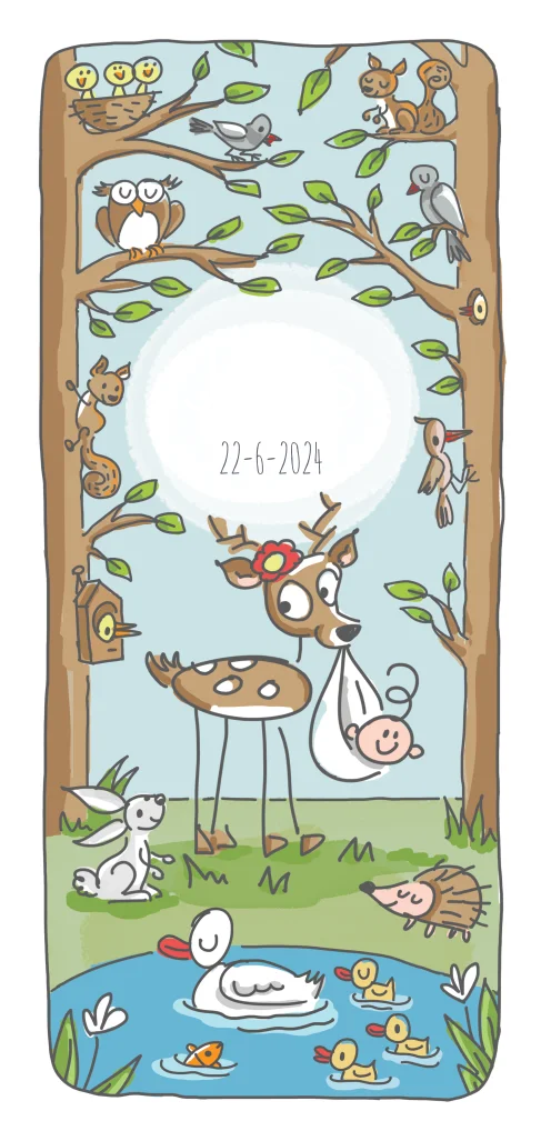 Kondig de geboorte van jullie zoontje aan met dit lieve kaartje. Op het kaartje staat de illustratie van een bos vol met dieren. De naam in goudfolie maakt dit kaartje helemaal compleet. Pas het kaartje naar wens aan in onze online editor!