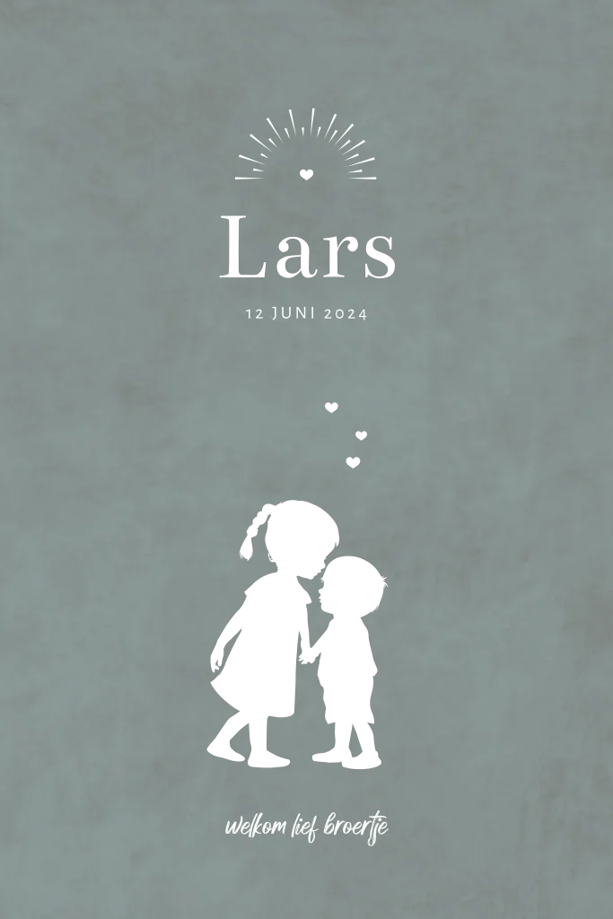 Het goudfolie silhouetje van een grote zus die haar kleine broertje een kus geeft staat centraal op dit kaartje. De naam en hartjes in goudfolie komen prachtig uit tegen de donkere achtergrond. De ronde hoekjes maken dit kaartje helemaal af. Pas het kaartje naar eigen wens aan in de online editor.