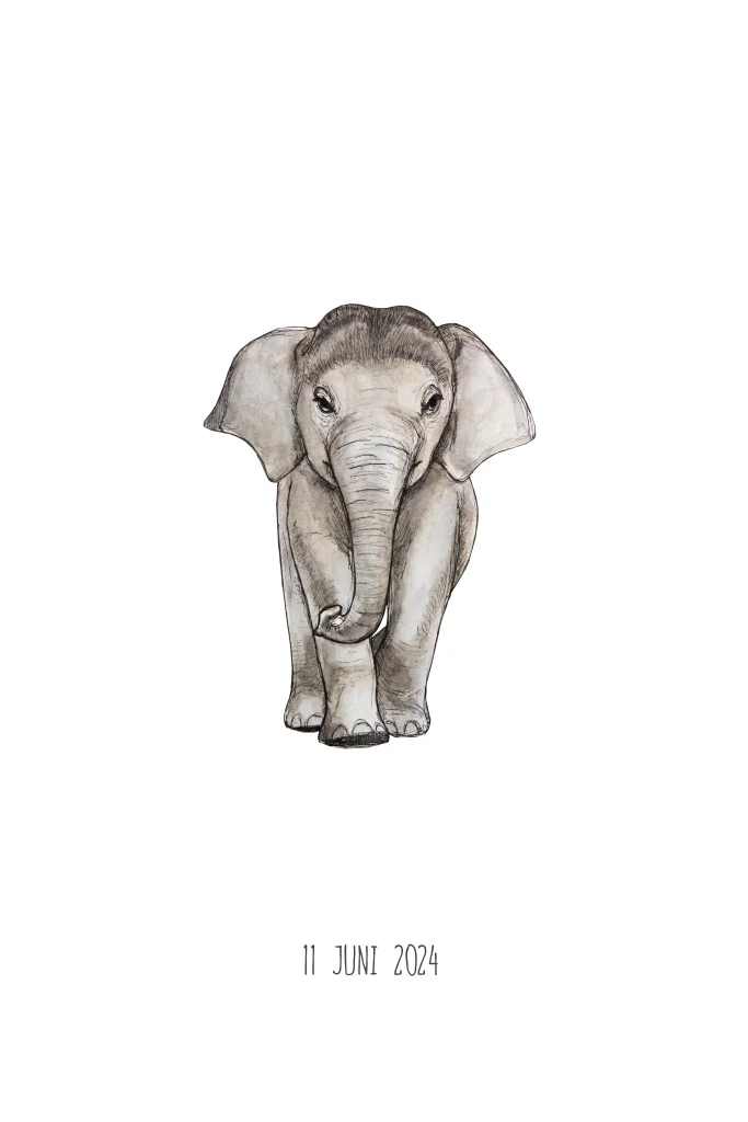 Op dit stoere geboortekaartje met ronde hoekjes staat de illustratie van een olifant. Het hartje boven de olifant en de naam van je zoontje worden gedrukt in goudfolie. Het kaartje kan je naar eigen wens aanpassen in de online editor.