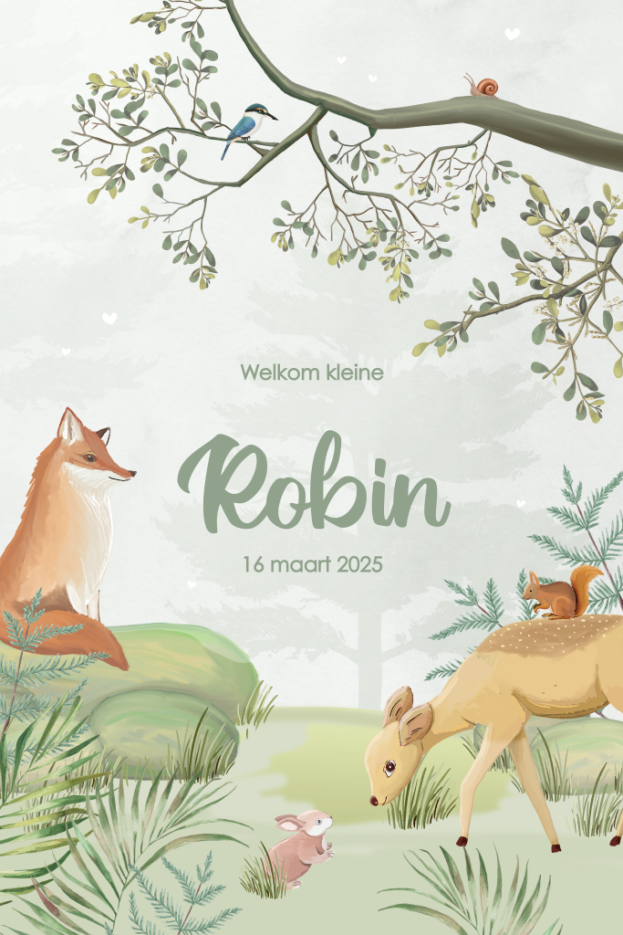 Unisex geboortekaartje met bosdieren, goudfolie en ronde hoeken