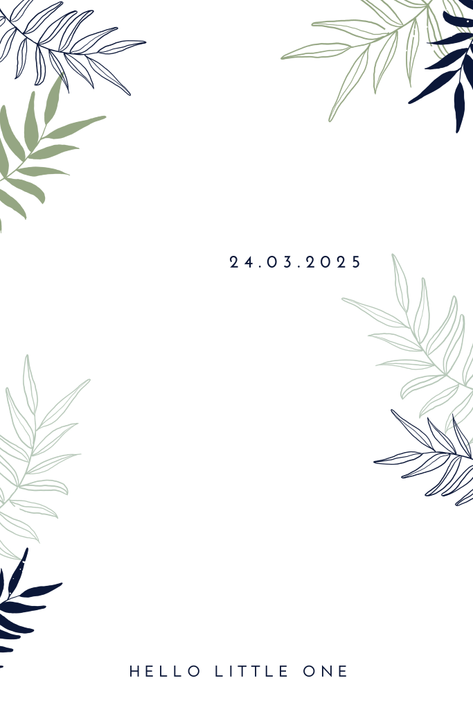 Goudfolie babykaartje voor jongetje of meisje met silhouetjes van dieren en jungle bladeren met ronde hoeken.