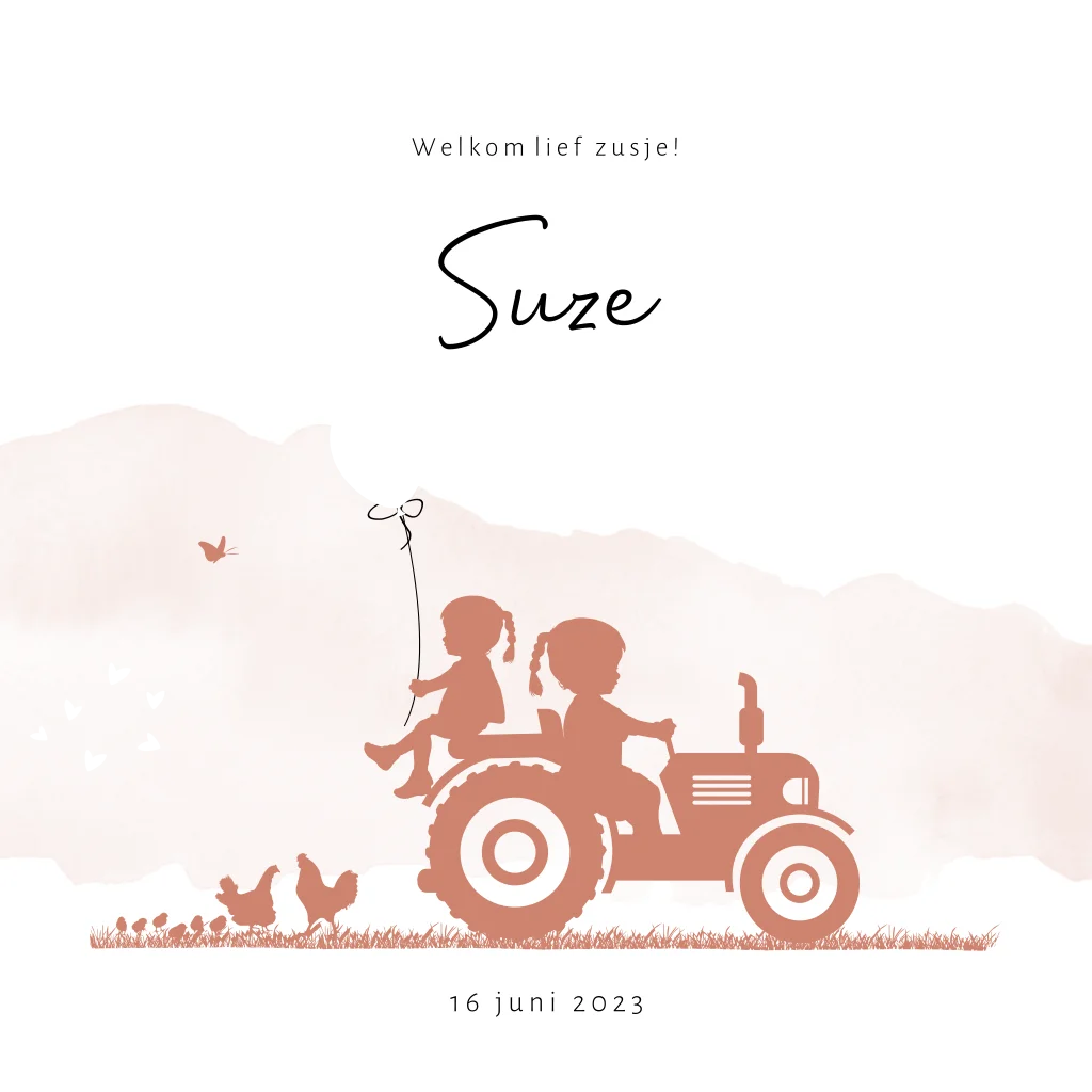 Verwachten jullie een zusje? Op dit stoere geboortekaartje staat het silhouet van twee meisjes op een tractor. De ballon die het meisje vastheeft en de hartjes worden gedrukt in roségoudfolie. Het kaartje is afgewerkt met ronde hoekjes.