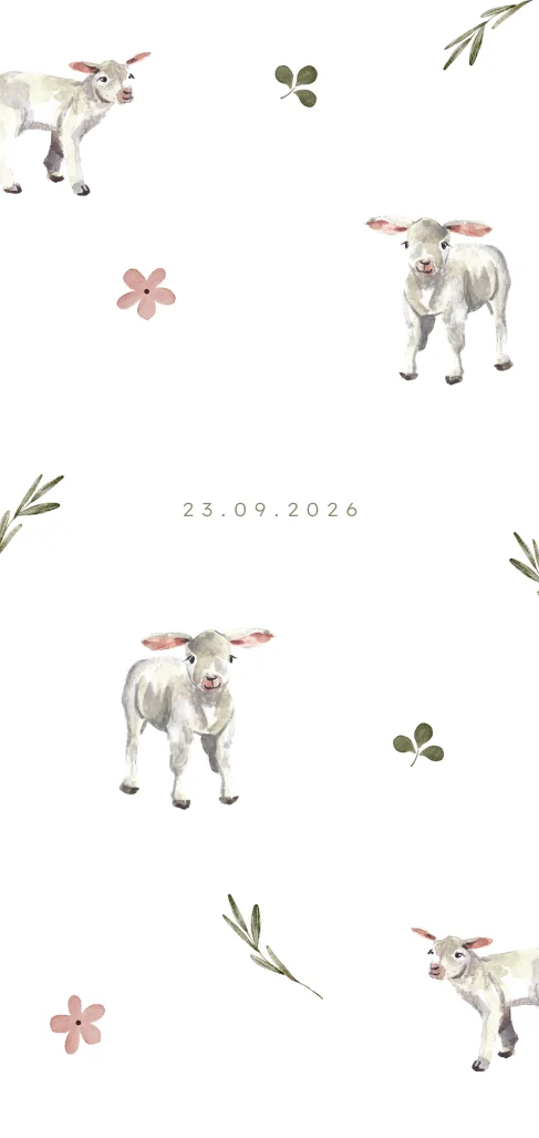 Goudfolie geboortekaartje met lammetjes, bloemen en takjes