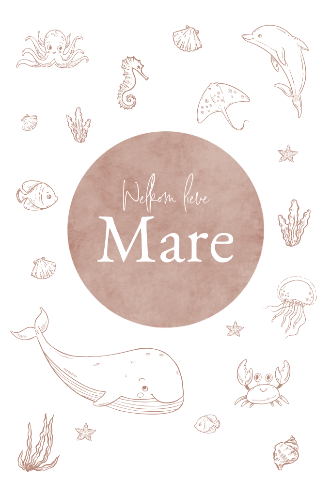 Dit is mooi kaartje met onderwaterwereld voor jullie pasgeboren dochtertje. De getekende zeedieren en de naamcirkel in oudroze sluiten prachtig bij elkaar aan. De roségoudfolie typografie en de ronde hoeken maken dit kaartje compleet. Bestel snel een proefdruk om dit kaartje in het echt te zien!