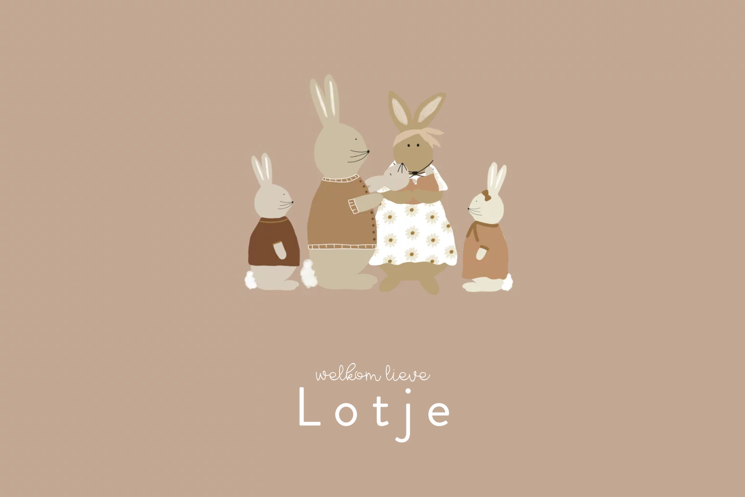 Dit is een schattig geboortekaartje voor jullie dochtertje. Op het kaartje staat de illustratie van een konijnen familie. De goudfolie typografie geeft dit kaartje een luxe uitstraling en de ronde hoeken maken dit kaartje helemaal compleet. Pas het kaartje naar wens aan in onze online editor en bestel snel een proefdruk om dit kaartje in het echt te zien!