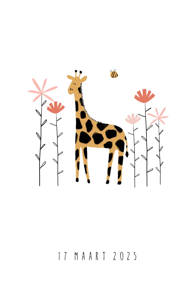 Dit is een vrolijk geboortekaartje voor een meisje. Op het kaartje staat de illustratie van een giraffe en takjes met bloemetjes. De roségoudfolie naam maakt dit kaartje compleet.