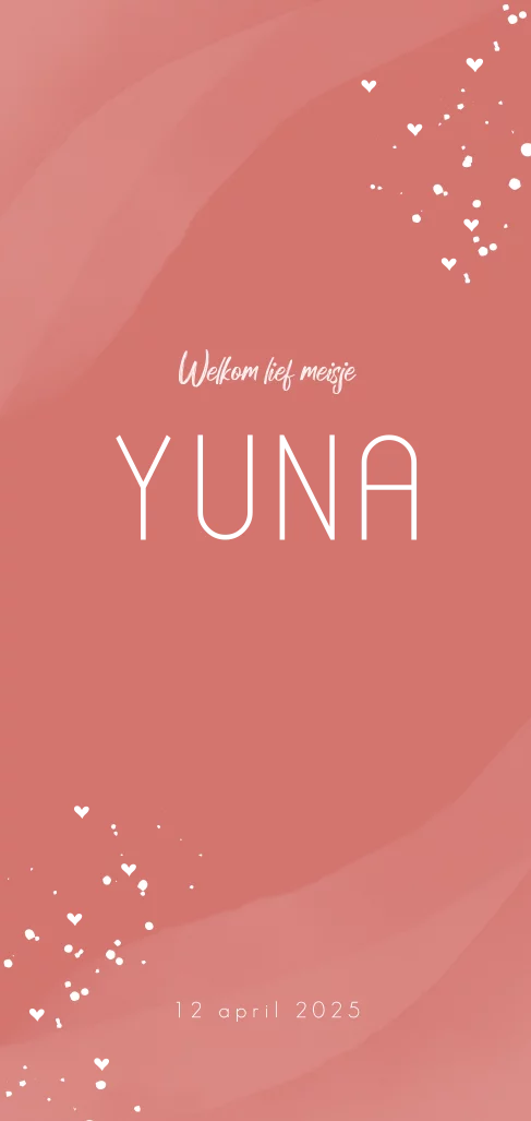 Dit schattige kaartje voor jullie pasgeboren dochtertje heeft witte verfspetters en gouden hartjes in twee hoeken. De naam in goudfolie en de geboortedatum in wit lettertype komen prachtig uit tegen de roze achtergrond. De ronde hoekjes maken dit kaartje helemaal compleet. Bestel snel een proefdruk om dit kaartje in het echt te zien!
