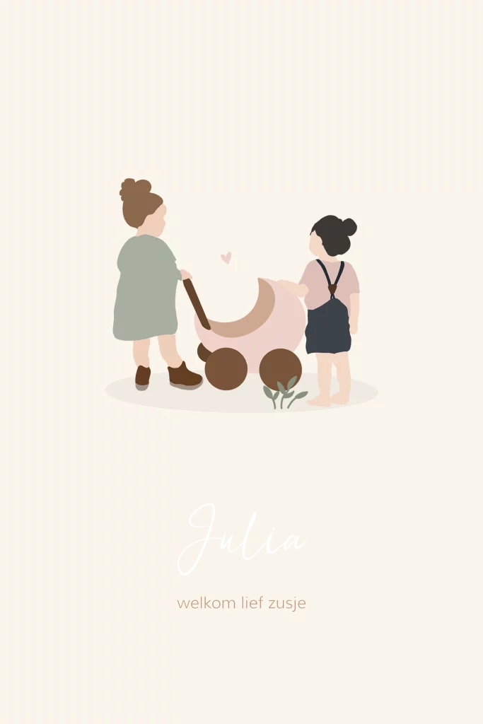 Kondig de geboorte van jullie derde kindje aan met dit lieve kaartje! Op het kaartje staan twee grote zussen geïllustreerd naast een kinderwagen. De naam van jullie dochter wordt gedrukt in koperfolie en de ronde hoeken maken dit kaartje helemaal af. Pas het kaartje naar wens aan in onze online editor en bestel snel een proefdruk om dit kaartje in het echt te zien!