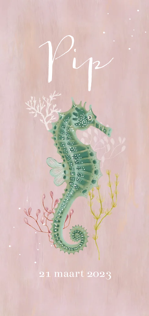 Een schattig babykaartje voor de geboorte van jullie dochter. Het groene zeepaardje met goudfolie details komt schitterend naar voren tegen de geschilderde roze achtergrond. Bestel snel een proefdruk om dit kaartje in het echt te bewonderen!