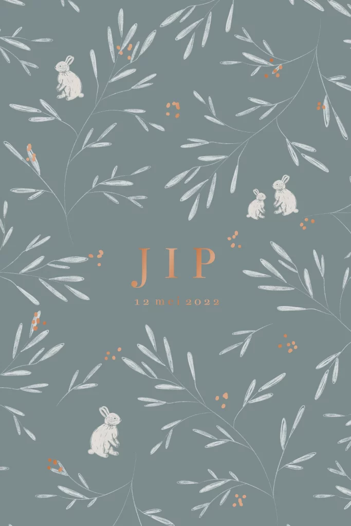 Dit is een mooi kaartje om de geboorte van jullie dochter of zoon aan te kondigen. Het kaartje heeft een prachtige blauwgrijze achtergrond met de tekeningen van takjes en konijnen. De hoogglans elementen en ronde hoeken maken dit kaartje helemaal compleet. Pas het kaartje naar wens aan in onze online editor en bestel snel een proefdruk om dit kaartje in het echt te zien!