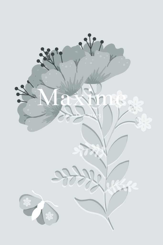 Dit is een lief geboortekaartje voor jullie pasgeboren dochter. Het kaartje heeft een lichtblauwe achtergrond met ronde hoeken. Op de kaart staat de illustratie van een bloem en een kleine vlinder. De naam, geboortedatum en het lijfje van de vlinder worden gedrukt in roségoudfolie. Pas het kaartje naar wens aan in onze online editor en bestel snel een proefdruk om dit kaartje in het echt te zien!
