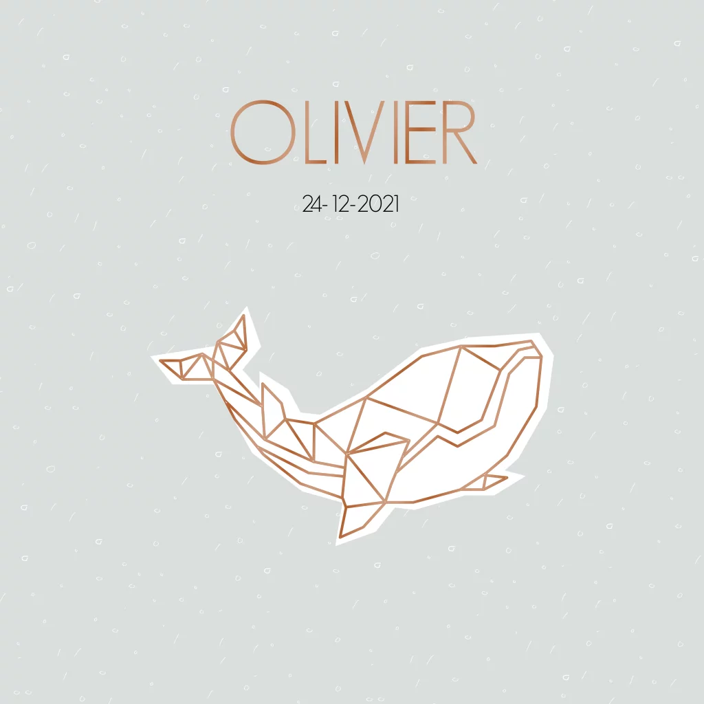 Een subtiel geboortekaartje met een illustratie van een walvis in hoogglans.