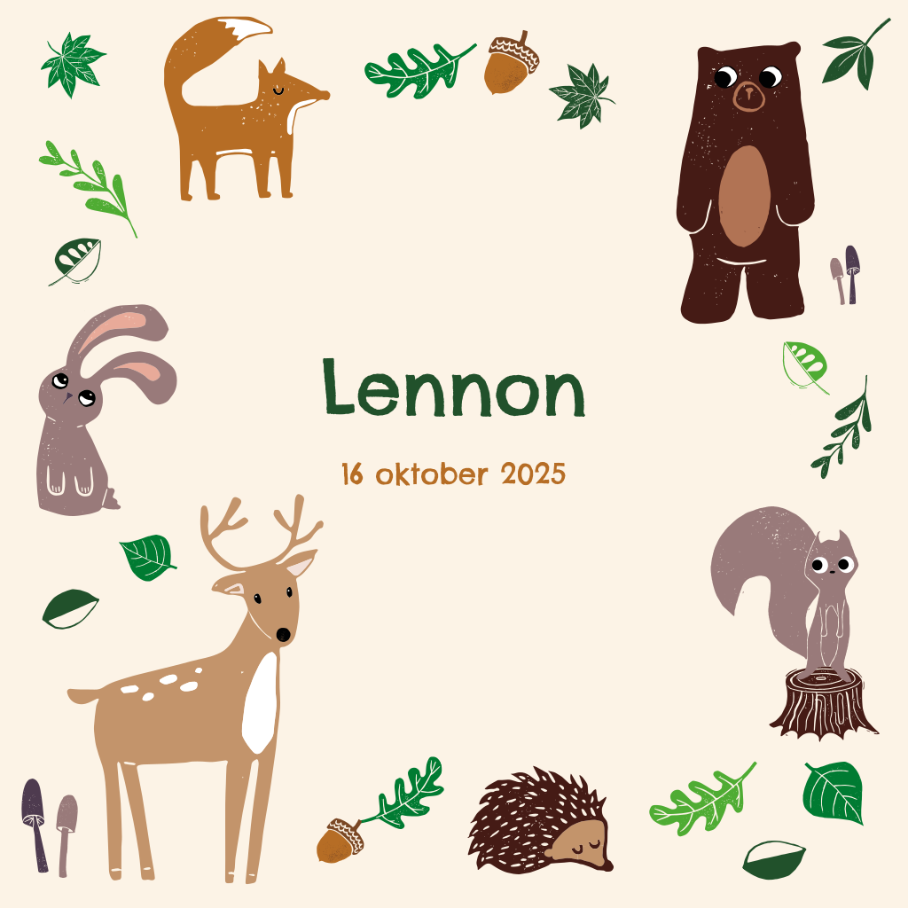 Herfst geboortekaartje met bosdieren en ronde hoeken