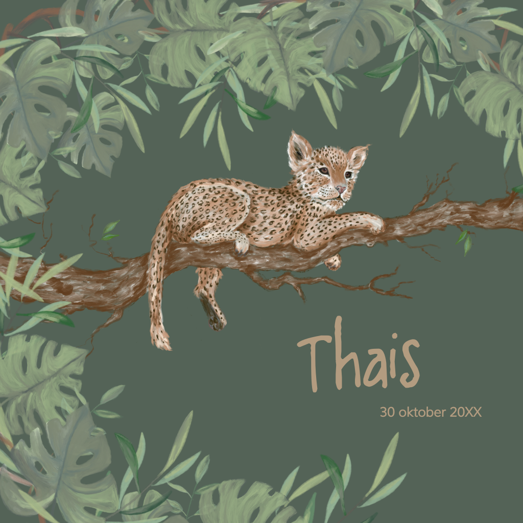 Dit jungle geboortekaartje heeft ronde hoeken en er is een illustratie van een baby pantertje op te zien. Het pantertje ligt op een tak en wordt omringd door junglebladeren. Pas het kaartje naar wens aan in de online editor.