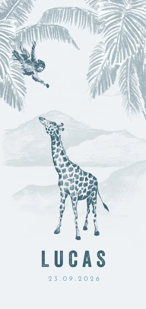 Origineel babykaartje met handgetekende illustratie van een klein girafje en een aapje in de boom. Dit blauwe kaartje is afgewerkt met ronde hoekjes. Pas de voorbeeldteksten gemakkelijk aan in de online editor.