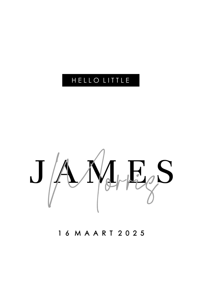 Op zoek naar een stijlvol, hip geboortekaartje voor je zoon? Dit kaartje met ronde hoeken en mooie typografie in zwart, grijs en wit is een echt eye catcher. Pas de teksten eenvoudig aan in de online editor en maak zo eenvoudig een uniek geboortekaartje.