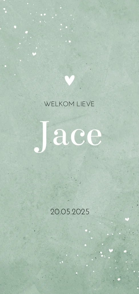 Lief en hip geboortekaartje met een trendy velvet look achtergrond in de kleur mint, een hartje en verfspatten. Het kaartje is afgewerkt met ronde hoeken. Personaliseer dit geboortekaartje in de online editor en verstuur hem om de geboorte van jullie zoon aan te kondigen!