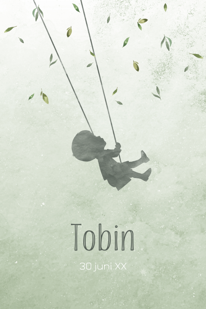 Dit is een lief geboortekaartje voor jullie zoon. Het kaartje heeft een groene watercolour achtergrond. Op het kaartje staat het silhouet van een schommelende jongen. De groene blaadjes in de lucht maken dit kaartje helemaal compleet. Bestel snel een proefdruk om dit kaartje in het echt te zien!