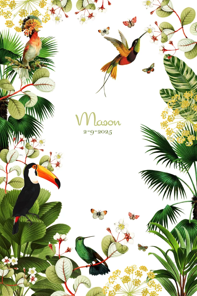 Hippe geboortekaartje voor een jongetje met groene bladeren, bloemen en tropische vogels. Dit kaartje in jungle thema is helemaal trendy!