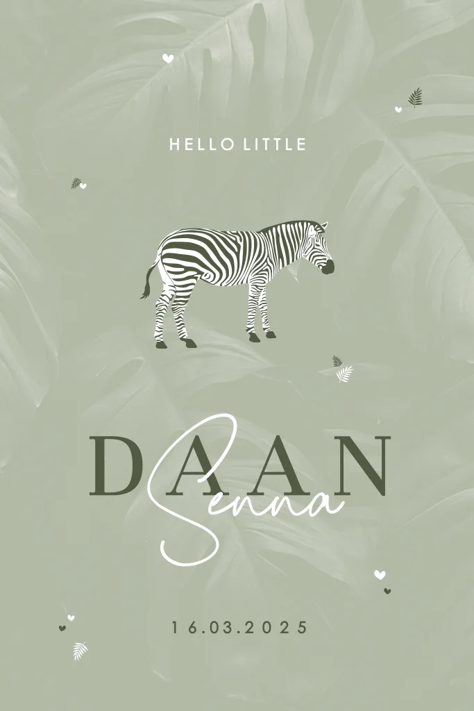 Een stoer kaartje voor de geboorte van jullie zoontje. Dit exemplaar heeft een groene achtergrondkleur met daarop een lichte print van jungle bladeren. Er staat een gave zebra boven de naam van jullie kleintje. Schattige hartjes en bladeren zijn op een aantal plekken nog toegevoegd.