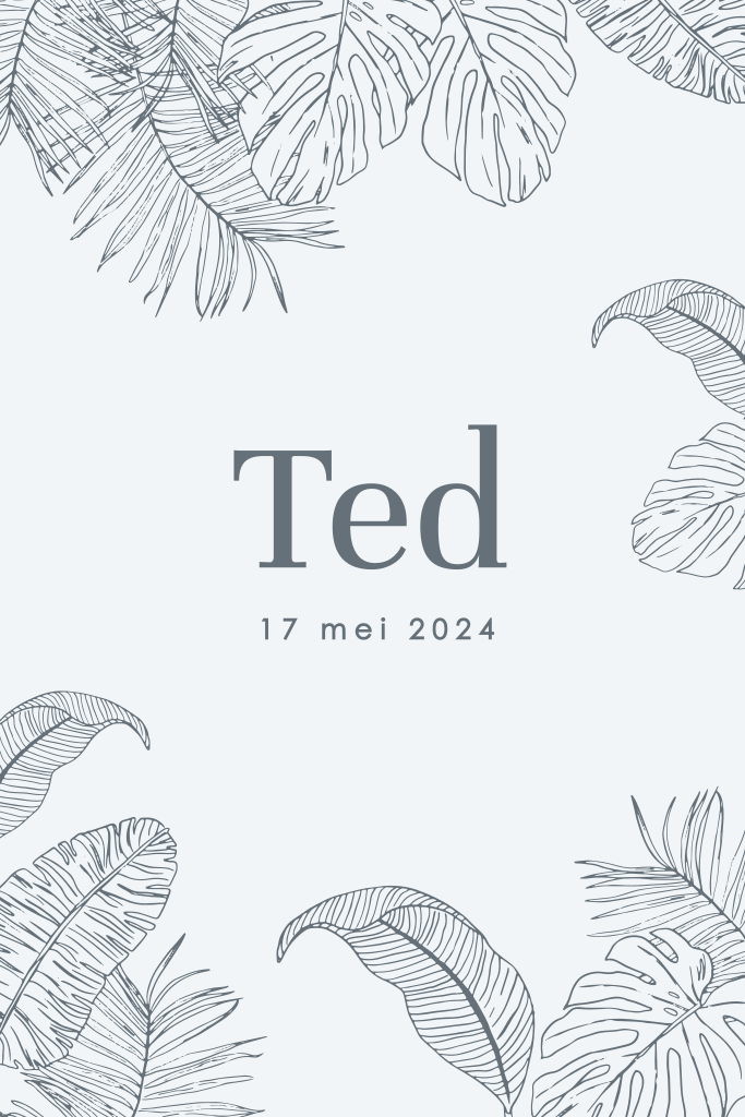 Een gaaf jungle babykaartje om de geboorte van jullie zoontje te vieren. De achtergrond heeft een lichtblauwe kleur en er zijn stijlvolle lijntekeningen van junglebladeren te zien in een donkerdere blauwe kleur. In het midden staat de naam van jullie kindje. De hoeken zijn rond bij dit exemplaar, wat het nog origineler maakt!
