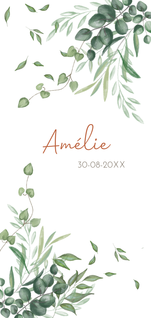 Lief staand unisex geboortekaartje met kleine handgetekende blaadjes en takjes in groene tinten.