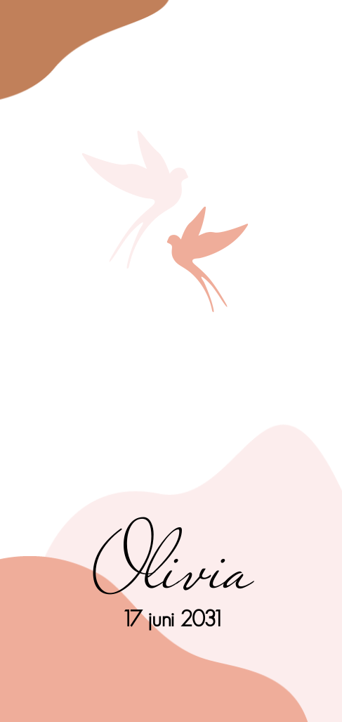 Rondhoek geboortekaartje met zwaluwen en vlakjes voor een meisje