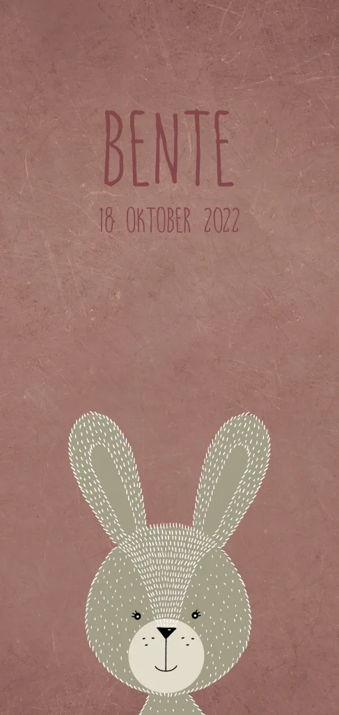 Minimalistisch kaartje voor de geboorte van jullie dochter. Het kaartje heeft een rode achtergrond met de illustratie van een konijntje. Het kaartje is afgewerkt met ronde hoekjes.