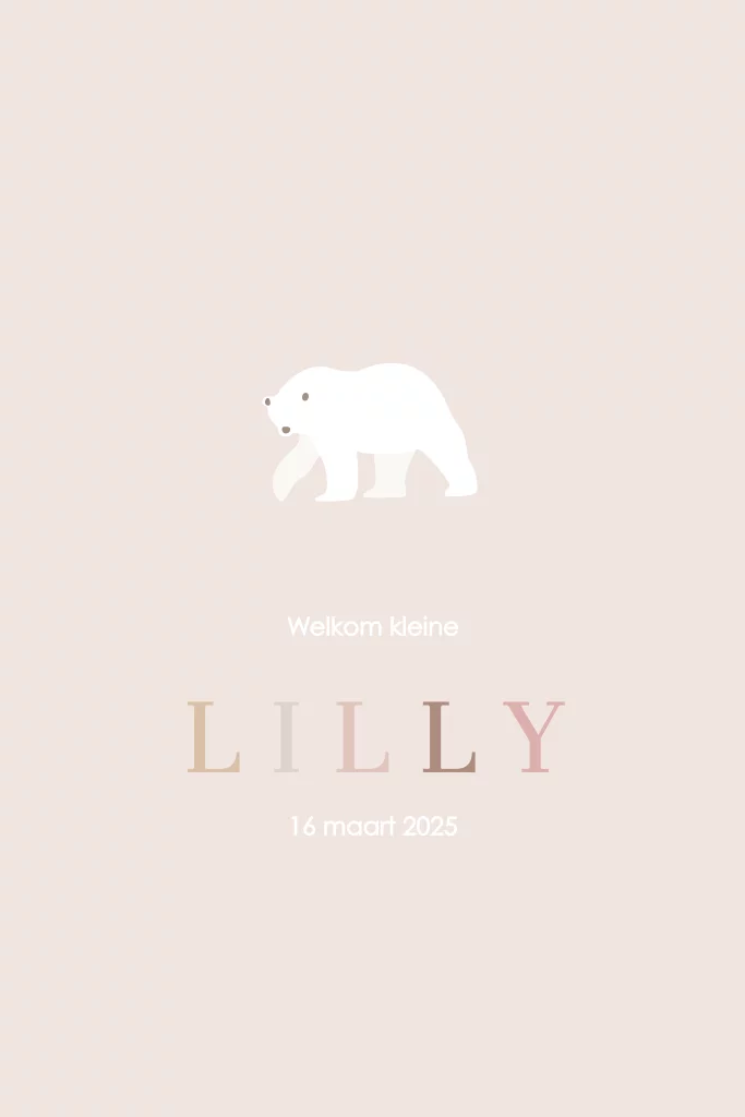 Kondig de geboorte van jullie dochtertje aan met dit schattige kaartje. De combinatie van de witte ijsbeer en de lichtroze achtergrond is erg zacht. De letters in verschillende kleuren maken dit kaartje extra vrolijk! Pas het kaartje naar wens aan in onze online editor en bestel snel een proefdruk om dit kaartje in het echt te zien.