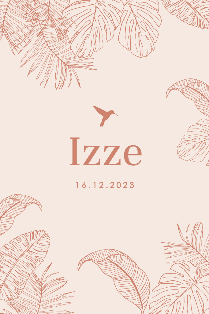 Een gaaf jungle babykaartje om de geboorte van jullie dochtertje te vieren. De achtergrond heeft een zachte kleur en er zijn stijlvolle lijntekeningen van junglebladeren te zien in een donkerdere roze tint. In het midden staat de naam van jullie kindje met een vogeltje erboven. De hoeken zijn rond bij dit exemplaar, wat het nog origineler maakt!