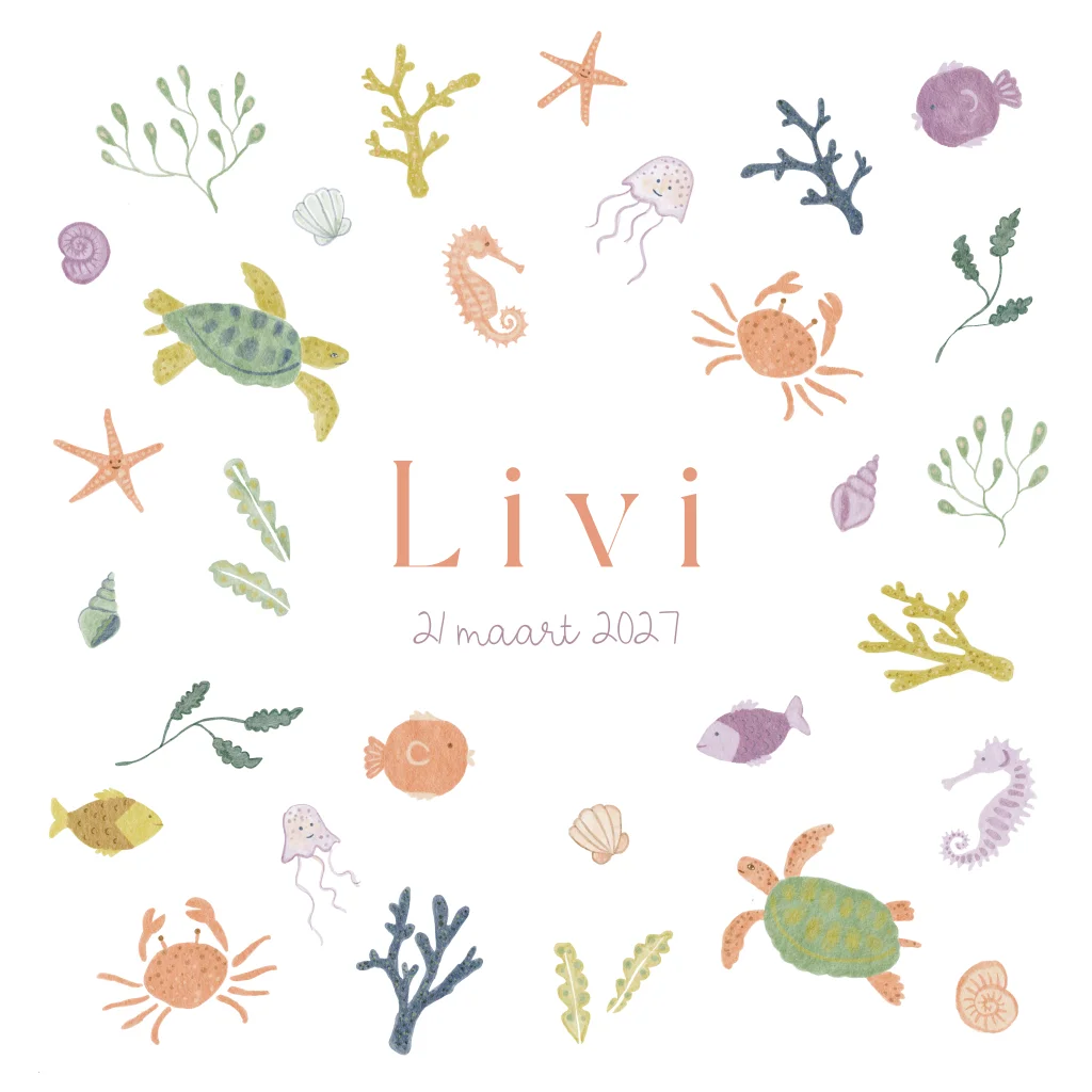 Lief getekend geboortekaartje met allerlei zeediertjes in mooi zachte tinten. De elementen komen nog mooier uit door de witte achtergrond. De ronde hoeken zorgen ervoor dat dit design het best tot zijn recht komt en zorgt voor een originele uitstraling.