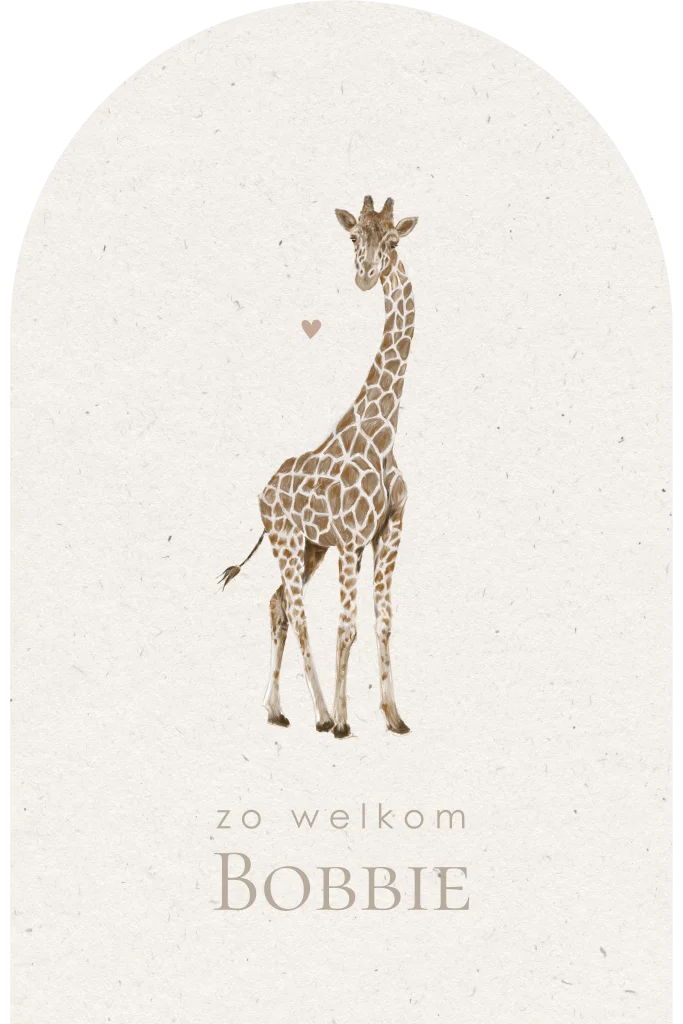 Dit is een origineel kaartje voor de geboorte van jullie zoon of dochter. De kaart heeft de vorm van een arch en heeft een mooie illustratie van een giraf. De zachte tinten in combinatie met de vezel structuur op de achtergrond is prachtig. Pas het kaartje naar wens aan in onze online editor en bestel snel een proefdruk om dit kaartje in het echt te zien! #kimberly