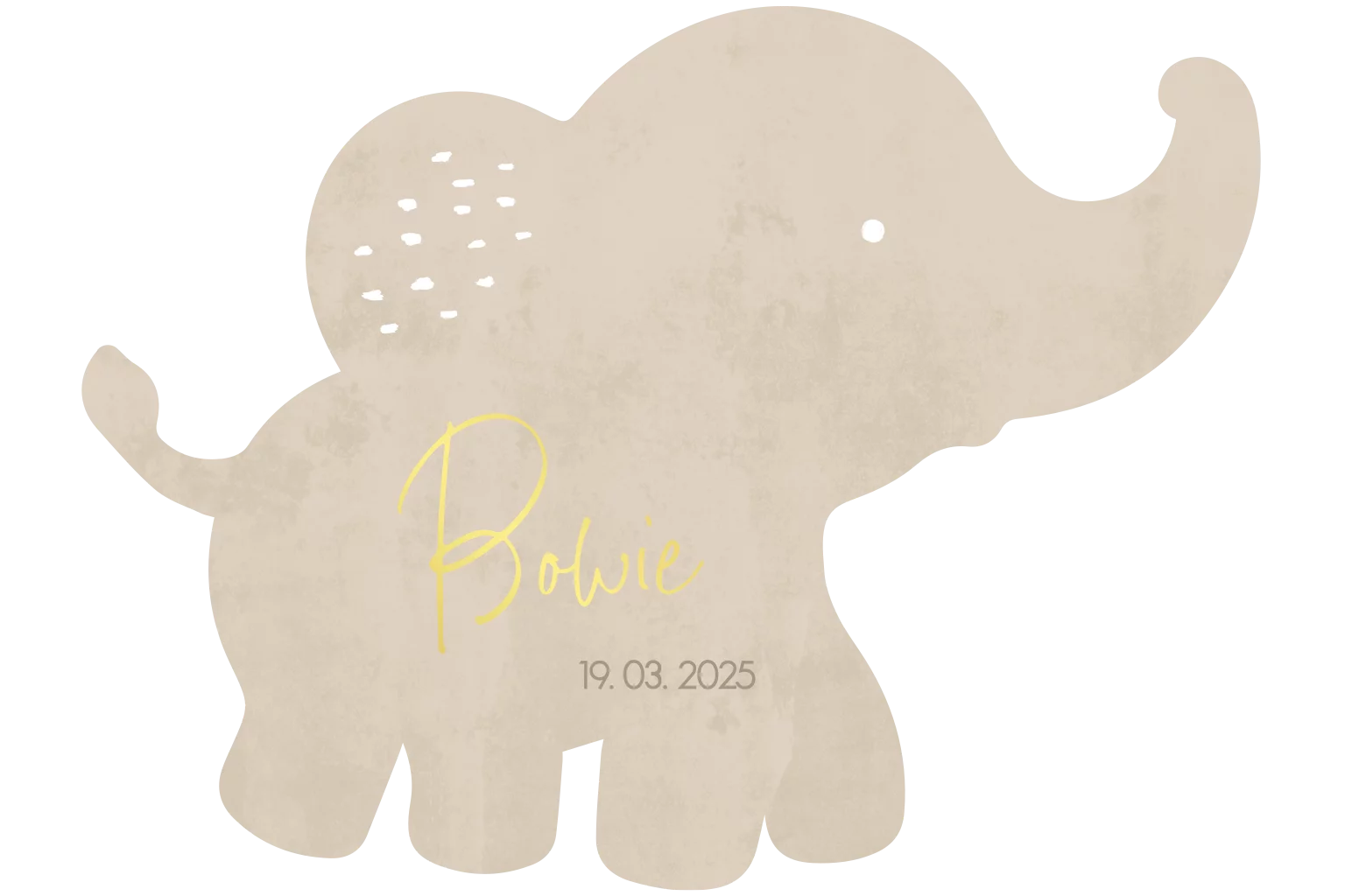 Beige goudfolie geboortekaartje in vorm van olifantje