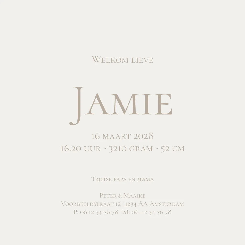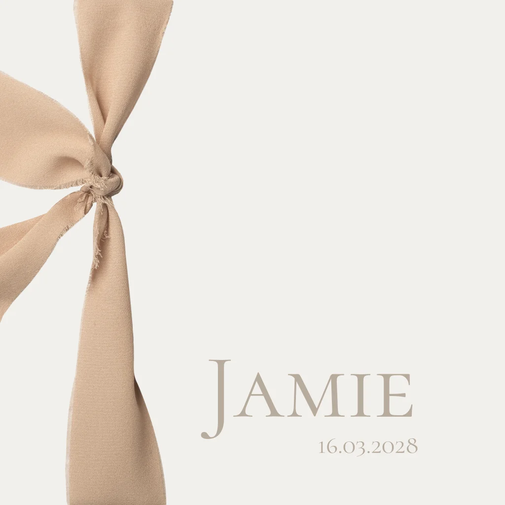 Kondig de geboorte van je zoon of dochter aan met dit prachtige kaartje. Het kaartje heeft een lichte achtergrond met twee gaatjes om een echt lint doorheen te rijgen en te knopen als een strik. Hoe bijzonder! Het kaartje kan naar wens aangepast worden in onze online editor.