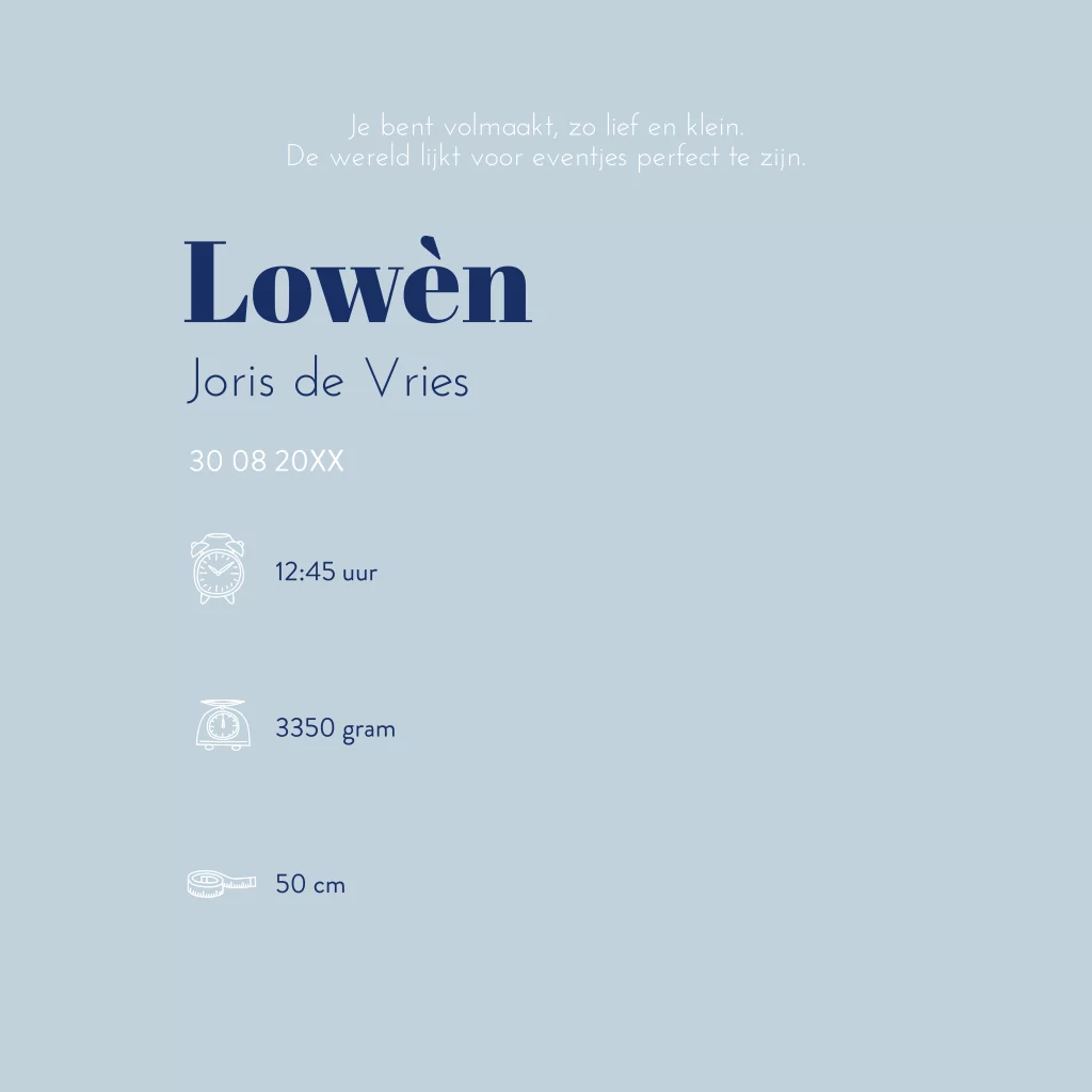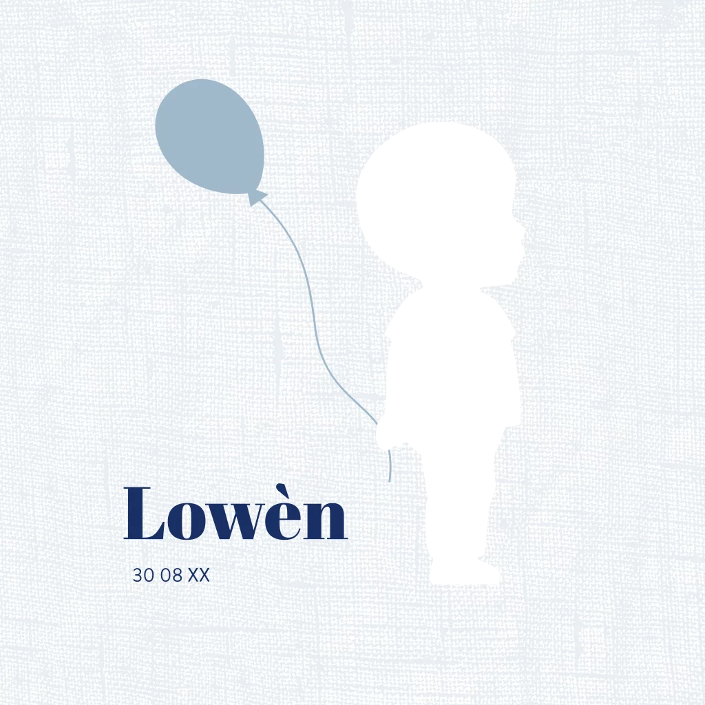 Wat een origineel geboortekaartje voor jouw zoontje. Het blauwe kaartje heeft een linnenlook achtergrond met een uitsnede van een silhouetje. Door het silhouetje kan je naar de binnenkant van het kaartje kijken. Pas het kaartje naar wens aan in onze online editor.